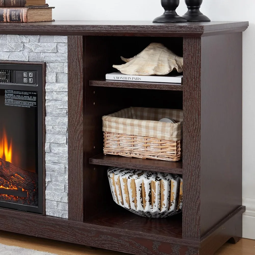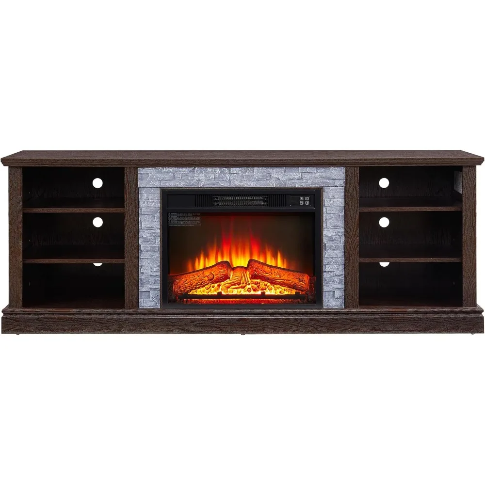 - INNOVATIVE DESIGN: This wood fireplace TV stand blends traditional and farmhouse styles, with faux stacked stone surrounding the center of the TV stand, adding a modern style to the TV stand entertainment center. Also housed in the center of the TV cabinet is a simulated electronic fireplace that enhances the need for quality of life and adds warmth whenever you need it, at the push of a button
