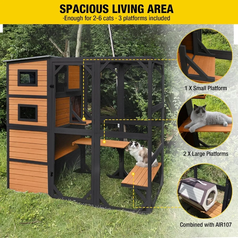 Large Cat Catio 4 Tiers Cat Enclosures House for Outdoor Indoor Cats with Weatherproof Roof, 3 Resting Rooms, 3 Platforms, 5 Wi