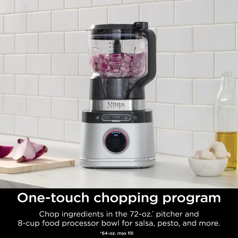 The Ninja Detect™ Power Kitchen System, TB400 with BlendSense™ Technology lets you toss in any ingredient, press the dial, and watch it transform into your blended output. Whether blending in the 72 oz. full-size pitcher or chopping in the 8-cup processor bowl, Ninja Detect makes live decisions on the amount of power, speed, and time needed to get you to a perfectly smooth outcome every time. The blender that automatically adjusts speed & time for perfectly smooth results.